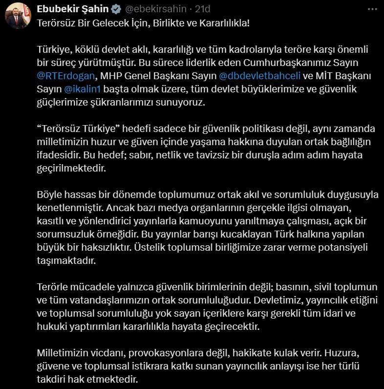 ANKARA, (DHA)- RADYO ve Televizyon Üst Kurulu (RTÜK) Başkanı Ebubekir Şahin, terör örgütü PKK'nın fesih kararına ilişkin, "Bazı medya organlarının gerçekle ilgisi olmayan, kasıtlı ve yönlendirici yayınlarla kamuoyunu yanıltmaya çalışması, açık bir sorumsuzluk örneğidir. Bu yayınlar barışı kucaklayan Türk halkına yapılan büyük bir haksızlıktır" dedi.RTÜK Başkanı Şahin, terör örgütü PKK'nın silah bırakma ve fesih kararıyla ilgili sosyal medya hesabından açıklama yaptı. Şahin, bu sürece liderlik eden Cumhurbaşkanı Recep Tayyip Erdoğan, MHP Genel Başkanı Devlet Bahçeli, MİT Başkanı İbrahim Kalın ve güvenlik güçlerine teşekkür ederek, 'Terörsüz Türkiye' hedefinin sadece bir güvenlik politikası değil, aynı zamanda milletin huzur ve güven içinde yaşama hakkına duyulan ortak bağlılığın ifadesi olduğunu belirtti.'MİLLETİMİZİN VİCDANI HAKİKATE KULAK VERİR'Şahin, 'Terörsüz Türkiye' hedefinin sabır, netlik ve tavizsiz bir duruşla adım adım hayata geçirilmekte olduğunu vurgulayarak, "Böyle hassas bir dönemde toplumumuz ortak akıl ve sorumluluk duygusuyla kenetlenmiştir. Ancak bazı medya organlarının gerçekle ilgisi olmayan, kasıtlı ve yönlendirici yayınlarla kamuoyunu yanıltmaya çalışması, açık bir sorumsuzluk örneğidir. Bu yayınlar barışı kucaklayan Türk halkına yapılan büyük bir haksızlıktır. Üstelik toplumsal birliğimize zarar verme potansiyeli taşımaktadır. Terörle mücadele yalnızca güvenlik birimlerinin değil; basının, sivil toplumun ve tüm vatandaşlarımızın ortak sorumluluğudur. Devletimiz, yayıncılık etiğini ve toplumsal sorumluluğu yok sayan içeriklere karşı gerekli tüm idari ve hukuki yaptırımları kararlılıkla hayata geçirecektir. Milletimizin vicdanı provokasyonlara değil, hakikate kulak verir. Huzura, güvene ve toplumsal istikrara katkı sunan yayıncılık anlayışı ise her türlü takdiri hak etmektedir" ifadelerini kullandı. (DHA)