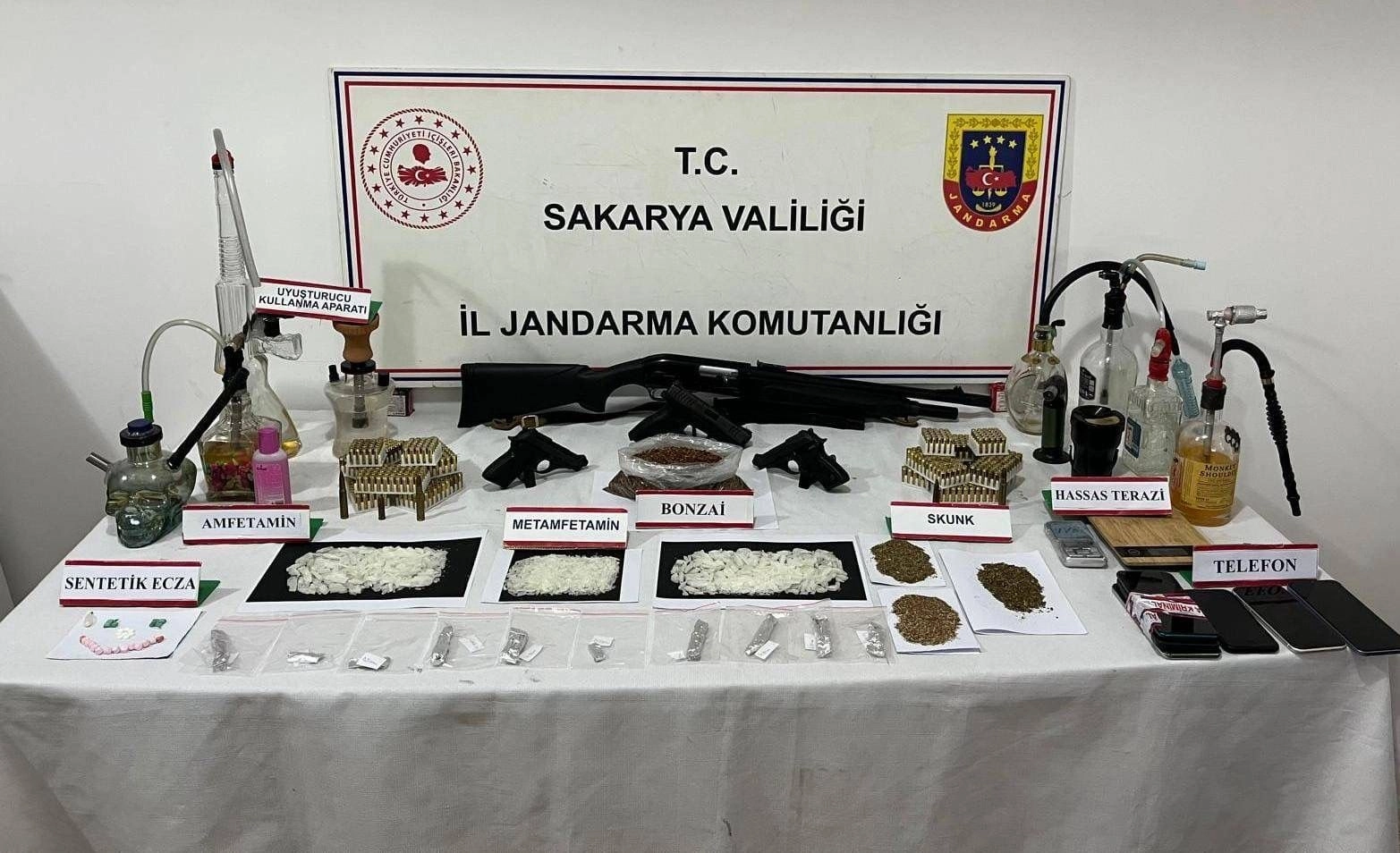 Serhat YILMAZ/ERENLER (Sakarya), (DHA)- SAKARYA'nın Erenler ilçesinde uyuşturucu ve silah kaçakçılarına yönelik operasyonda gözaltına alınan 4 şüpheliden 2'si tutuklandı. Sakarya İl Jandarma Komutanlığı ekipleri, 16 Nisan'da Erenler ilçesinde uyuşturucu ve silah kaçakçılığına yönelik 6 adrese eş zamanlı operasyon düzenledi. Eş zamanlı baskınlarda M.Ç. (43), E.G. (26), K.A. (34) ve Ç.Ü. (33), gözaltına alındı. Şüphelilerin adreslerinde yapılan aramalarda, 220 gram metamfetamin, 200 gram sentetik kannabinoid (bonzai), 30 gram skunk, 40 gram satışa hazır metamfetamin (10 alüminyum folyoya sarılı), 30 sentetik hap, 100 ml sıvı amfetamin, 8 uyuşturucu kullanma aparatı, 2 hassas terazi, 2 ruhsatsız tabanca, 727 adet 9 mm tabanca fişeği, 1 yarı otomatik av tüfeği ve 6 cep telefonu ele geçirildi. İşlemleri tamamlanan 4 şüpheliden 2'si tutuklandı, 1'i adli kontrol şartıyla 2'si serbest bırakıldı. (DHA)