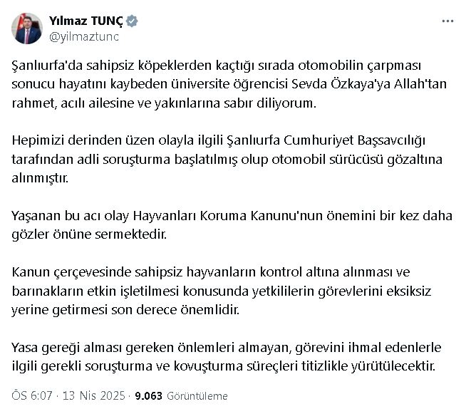 ADALET BAKANI TUNÇ'TAN AÇIKLAMAAdalet Bakanı Yılmaz Tunç, sosyal medya hesabından yaptığı açıklamada, Şanlıurfa'da sahipsiz köpeklerden kaçtığı sırada otomobilin çarpması sonucu hayatını kaybeden üniversite öğrencisi Sevda Özkaya'ya Allah'tan rahmet, yakınlarına başsağlığı dileğinde bulundu. Bakan Tunç, "Hepimizi derinden üzen olayla ilgili Şanlıurfa Cumhuriyet Başsavcılığı tarafından adli soruşturma başlatılmış olup, otomobil sürücüsü gözaltına alınmıştır. Yaşanan bu acı olay, Hayvanları Koruma Kanunu'nun önemini bir kez daha gözler önüne sermektedir. Kanun çerçevesinde sahipsiz hayvanların kontrol altına alınması ve barınakların etkin işletilmesi konusunda yetkililerin görevlerini eksiksiz yerine getirmesi son derece önemlidir. Yasa gereği alması gereken önlemleri almayan, görevini ihmal edenlerle ilgili gerekli soruşturma ve kovuşturma süreçleri titizlikle yürütülecektir" ifadelerini kullandı. (DHA)