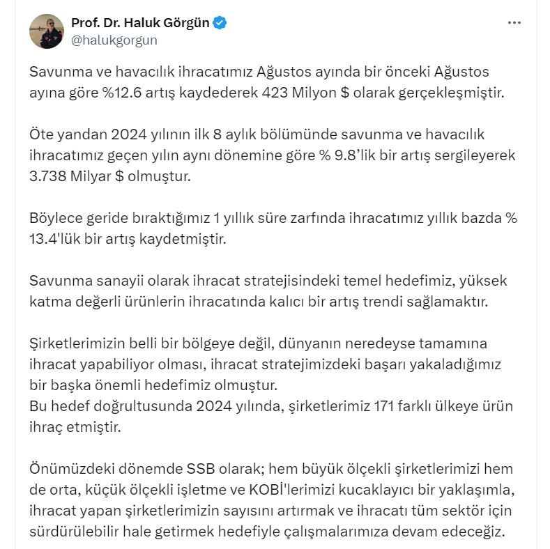 ANKARA, (DHA)-SAVUNMA Sanayii Başkanı Haluk Görgün, savunma ve havacılık sanayi ihracatının ağustos ayında 423 milyon dolar olarak gerçekleştiğini duyurdu.Savunma Sanayii Başkanı Görgün, sosyal medya hesabından yaptığı açıklamada, "Savunma ve havacılık ihracatımız ağustos ayında bir önceki ağustos ayına göre yüzde 12,6 artış kaydederek 423 milyon dolar olarak gerçekleşmiştir. Öte yandan 2024 yılının ilk 8 aylık bölümünde savunma ve havacılık ihracatımız geçen yılın aynı dönemine göre yüzde 9,8'lik bir artış sergileyerek 3,738 milyar dolar olmuştur. Böylece geride bıraktığımız 1 yıllık süre zarfında ihracatımız yıllık bazda yüzde 13,4'lük bir artış kaydetmiştir" dedi. 'ŞİRKETLERİMİZ 171 FARKLI ÜLKEYE ÜRÜN İHRAÇ ETMİŞTİR'İhracat stratejisindeki temel hedeflerinin, yüksek katma değerli ürünlerin ihracatında kalıcı bir artış trendi sağlamak olduğunu vurgulayan Görgün, "Şirketlerimizin belli bir bölgeye değil, dünyanın neredeyse tamamına ihracat yapabiliyor olması, ihracat stratejimizdeki başarı yakaladığımız bir başka önemli hedefimiz olmuştur. Bu hedef doğrultusunda 2024 yılında, şirketlerimiz 171 farklı ülkeye ürün ihraç etmiştir. Önümüzdeki dönemde SSB olarak; hem büyük ölçekli şirketlerimizi hem de orta, küçük ölçekli işletme ve KOBİ'lerimizi kucaklayıcı bir yaklaşımla, ihracat yapan şirketlerimizin sayısını artırmak ve ihracatı tüm sektör için sürdürülebilir hale getirmek hedefiyle çalışmalarımıza devam edeceğiz" açıklamasında bulundu. (DHA)