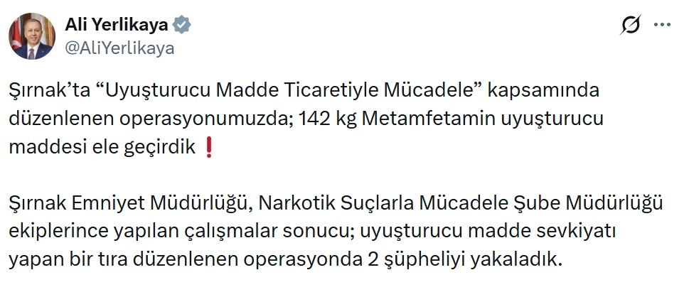 İçişleri Bakanı Yerlikaya, polis tarafından düzenlenen narkotik operasyonunu sanal medya hesabından duyurdu. Buna göre; Narkotik Suçlarla Mücadele Şube Müdürlüğü ekipleri tarafından uyuşturucu madde sevkiyatı yapıldığı belirlenen TIR'da yapılan aramada 142 kilogram metamfetamin ele geçirildi, araçta bulunan 2 şüpheli gözaltına alındı.