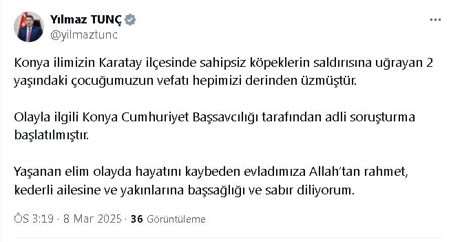 BAKAN TUNÇ'TAN AÇIKLAMAAdalet Bakanı Yılmaz Tunç, sosyal medya hesabından yaptığı açıklamada, "Konya ilimizin Karatay ilçesinde sahipsiz köpeklerin saldırısına uğrayan 2 yaşındaki çocuğumuzun vefatı hepimizi derinden üzmüştür. Olayla ilgili Konya Cumhuriyet Başsavcılığı tarafından adli soruşturma başlatılmıştır. Yaşanan elim olayda hayatını kaybeden evladımıza Allah'tan rahmet, kederli ailesine ve yakınlarına başsağlığı ve sabır diliyorum" dedi. (DHA)