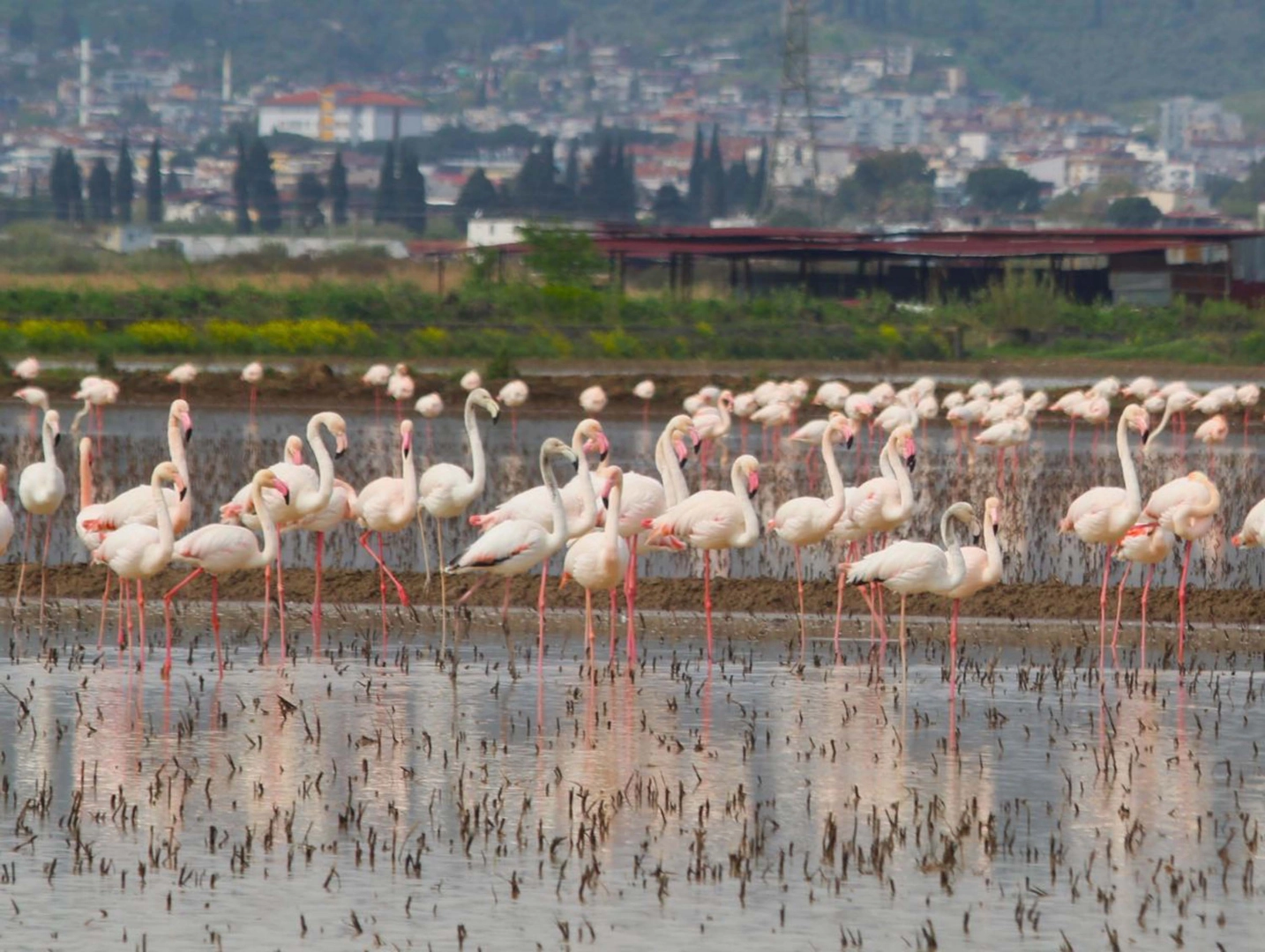 Bahattin ALBAYRAK/AYDIN, (DHA)- AYDIN'da Söke Ovası, son günlerde etkili olan yağışların ardından göçmen kuşların uğrak noktası haline geldi. Suyla dolan tarlalara inen flamingolar, doğaya eşsiz bir güzellik katarken, Ekosistemi Koruma ve Doğa Sevenler Derneği (EKODOSD) Başkanı Bahattin Sürücü, flamingolar gibi birçok su kuşunun ve diğer canlıların yaşam alanlarının sürekli azaldığına dikkat çekti.Geçmiş yıllarda yaban kazlarının, turnaların, kuğuların indiği Söke Ovası'nda tarlalardaki yağmur sularına birçok kuş gelmeye devam ediyor. Birkaç günden bu yana bölgeye yağan yağmurlarla birlikte suyla dolan Söke Organize Sanayi Bölgesi'nin yanındaki tarlalarda yüzlerce flamingo konaklamaya başladı. Flamingolar görsel bir şölen oluşturdu.'YAŞAM ALANLARI SÜREKLİ AZALMAKTA'EKODOSD Başkanı Bahattin Sürücü, flamingolar gibi birçok su kuşunun ve diğer canlıların yaşam alanlarının sürekli azalmakta olduğuna dikkat çekti. Sürücü, "Çiftçilerin ve biyolojik çeşitliliğin en önemli ihtiyacı olan suyun karşılandığı 'azmak' adı verilen sulak alanlar, organize sanayi bölgesindeki fabrikalardan getirilen katı atıklarla doldurulmaktadır. Suyla dolu tarlaların içinde beslenmelerini ve dinlenmelerini gerçekleştiren flamingolar gibi birçok su kuşunun ve diğer canlıların yaşam alanları sürekli azalmakta, hayatlarını devam ettirecekleri sular hızla kirletilmektedir. Kuzeyinde taş ocakları, güneyinde maden ocakları, enerji projeleri nedeniyle yok edilen ormanları, makilikleri, endüstriyel tesislerin ve jeotermal işletmelerin arıtmasız atıklarıyla hoyratça kirletilen Büyük Menderes Nehri'ndeki çevresel sorunlar Söke'nin geleceğini olumsuz etkilemektedir. Bu duruma bir çare ve çözüm bulunmalıdır" dedi.Sürücü, "Halk sağlığını ve tüm canlıları tehdit eden çevre sorunlarını gidermek ve bugün flamingoların geldiği gibi su kuşlarının gelecekte de gelmesini sağlayacak sulak alanlarımızı korumak için ilgili tüm kamu kurumları, yerel yönetimler ve sivil toplum örgütleri birlikte çalışmalıyız. Ortak projeler üreterek bu çok önemli sorunlara çözüm yolları bulmalıyız" diye konuştu. (DHA)