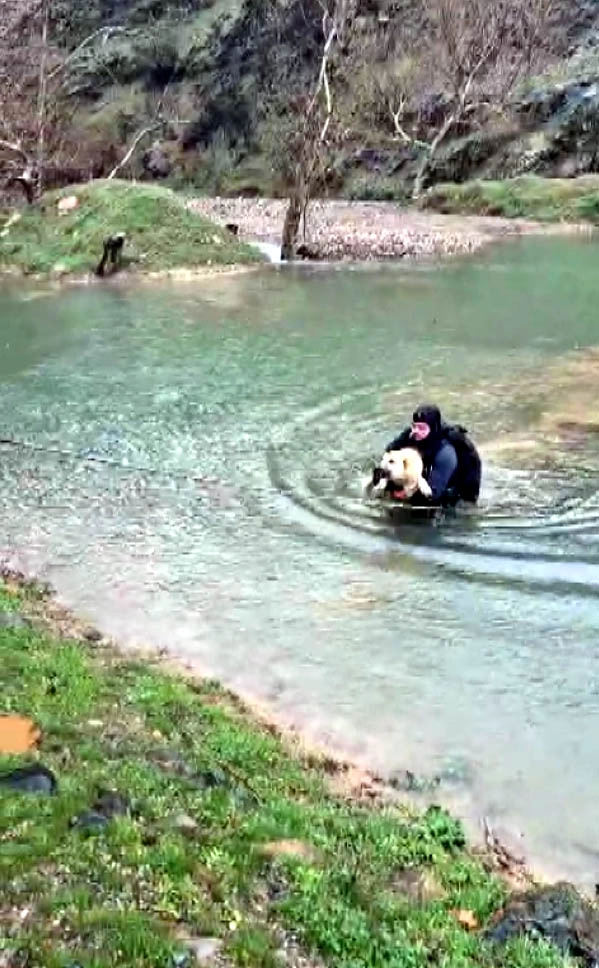 Ömer KOÇ/KAHRAMANMARAŞ, (DHA)- KAHRAMANMARAŞ’ta suyla çevrili bölgede mahsur kalan köpeği, itfaiye eri kurtardı.