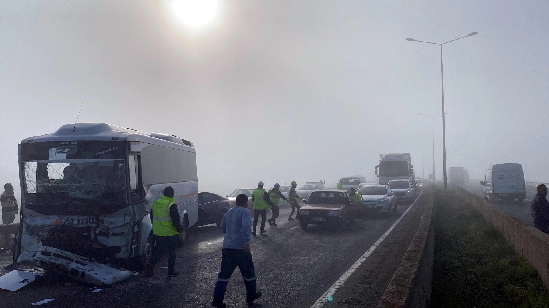 Mehmet YİRUN- Mehmetcan ARSLAN/ÇORLU (Tekirdağ), (DHA)- TEKİRDAĞ'ın Çorlu ilçesinde yoğun sis nedeniyle 4 aracın karıştığı zincirleme kazada 7 kişi yaralandı.Kaza, Çorlu-İstanbul kara yolu üzerindeki askeri havaalanı ışıklı kavşakta meydana geldi. Yoğun sis nedeniyle görüş mesafesinin düştüğü bölgede, T.Y.'nin kullandığı, 34 LAR 979 plakalı işçileri taşıyan servis midibüsü, önünde seyreden T.E. yönetimindeki 06 AU 4914 plakalı TIR'a arkadan çarptı. Kazaya otomobil ile bir TIR daha karıştı. Kazada işçi servisinde bulunan T.Y., R.T., A.K., G.A., M.B., Y.U. ve E.A., yaralandı. İhbarla bölgeye, jandarma, sağlık ve itfaiye ekipleri sevk edildi. Yaralılar, Çorlu Devlet Hastanesi'ne kaldırıldı. Çorlu İlçe Jandarma Komutanı Binbaşı Engin Türk kaza yerine gelerek bilgi aldı. (DHA)