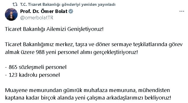 ANKARA, (DHA)- TİCARET Bakanı Ömer Bolat, bakanlık merkez, taşra ve döner sermaye teşkilatlarında görev almak üzere 988 yeni personel alımı gerçekleştirileceğini açıkladı. Ticaret Bakanı Ömer Bolat, sosyal medya hesabından yaptığı açıklamada, "Ticaret Bakanlığı ailemizi genişletiyoruz. Ticaret Bakanlığımız merkez, taşra ve döner sermaye teşkilatlarında görev almak üzere 988 yeni personel alımı gerçekleştiriyoruz. 865 sözleşmeli personel, 123 kadrolu personel, muayene memurundan gümrük muhafaza memuruna, mühendisten kaptana kadar birçok alanda yeni çalışma arkadaşlarımızı bekliyoruz" dedi. (DHA)