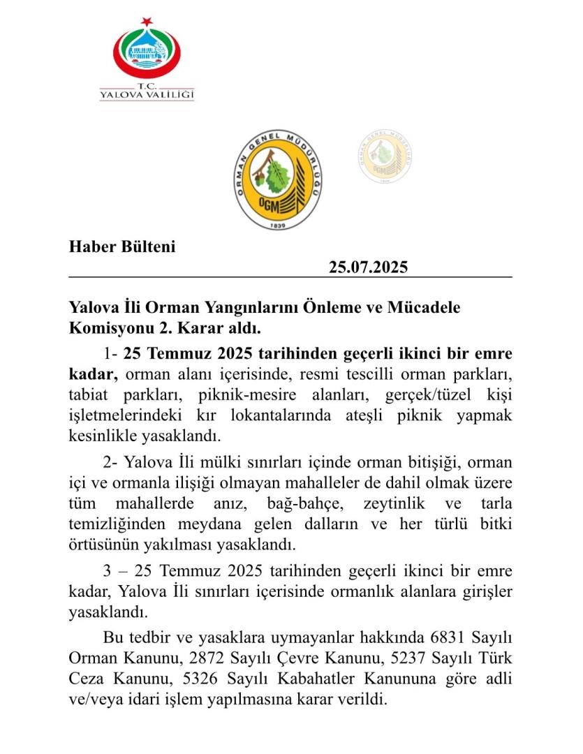 Zehra BAYKAL/ YALOVA, (DHA)- YALOVA Valiliği tarafından yapılan açıklamada, 2'nci bir emre kadar ormanlara girişler yasaklandı. Yalova Valiliği tarafından yapılan açıklamada, Yalova İli Orman Yangınlarını Önleme ve Mücadele Komisyonu'nun orman yangınlarını önleme amacıyla bazı kararlar aldığı belirtildi. 25 Temmuz 2025 tarihinden geçerli ikinci bir emre kadar orman alanı içerisinde resmi tescilli orman parkları, tabiat parkları, piknik-mesire alanları, gerçek veya tüzel kişi işletmelerindeki kır lokantalarında ateşli piknik yapmanın yasaklandığı belirtildi.Yapılan yazılı açıklamada, "Yalova ili mülki sınırları içinde orman bitişiği, orman içi ve ormanla ilişiği olmayan mahalleler de dahil olmak üzere tüm mahallerde anız, bağ- bahçe, zeytinlik ve tarla temizliğinden meydana gelen dalların ve her türlü bitki örtüsünün yakılması yasaklandı. 25 Temmuz 2025 tarihinden geçerli ikinci bir emre kadar Yalova ili sınırları içerisinde ormanlık alanlara girişler yasaklandı. Bu tedbir ve yasaklara uymayanlar hakkında 6831 Sayılı Orman Kanunu, 2872 Sayılı Çevre Kanunu, 5237 Sayılı Türk Ceza Kanunu, 5326 Sayılı Kabahatler Kanununa göre adli ve/veya idari işlem yapılmasına karar verildi" denildi. (DHA)