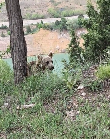 Uğur YİĞİT/SİVAS, (DHA)- SİVAS'ın Hafik ilçesinde doğada yiyecek arayan yavru ayı, cep telefonuyla görüntülendi.Hafik ilçesine bağlı Pusat köyünde araçlarıyla gezintiye çıkan bir grup arkadaş, ağaç kenarında yavru ayı olduğunu fark etti. Yiyecek aramak için Pusat-Özen Barajı kıyısına kadar gelen ve beslendiği gözlenen yavru ayı, arkadaş grubundan birinin cep telefonuyla görüntülendi. Görüntüleyen kişilerin yavru ayıya "Burada balık var, ot yeme, balığı ye" diye seslendiği anlar da kaydedildi. Bir süre bölgede dolaşan yavru ayı, kendini görüntüleyen kişileri izledi. Yavru ayı karnını doyurduktan sonra bölgeden uzaklaştı. (DHA)