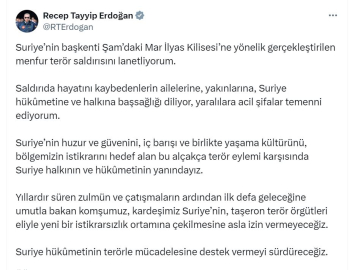 ANKARA, (DHA)- CUMHURBAŞKANI Recep Tayyip Erdoğan, Suriye'deki kiliseye yönelik terör saldırısıyla ilgili, "Suriye'nin huzur ve güvenini, iç barışı ve birlikte yaşama kültürünü, bölgemizin istikrarını hedef alan bu alçakça terör eylemi karşısında Suriye halkının ve hükümetinin yanındayız. Suriye hükümetinin terörle mücadelesine destek vermeyi sürdüreceğiz" dedi.Cumhurbaşkanı Erdoğan, sosyal medya hesabından yaptığı açıklamada, "Suriye'nin başkenti Şam'daki Mar İlyas Kilisesi'ne yönelik gerçekleştirilen menfur terör saldırısını lanetliyorum. Saldırıda hayatını kaybedenlerin ailelerine, yakınlarına, Suriye hükümetine ve halkına başsağlığı diliyor, yaralılara acil şifalar temenni ediyorum. Suriye'nin huzur ve güvenini, iç barışı ve birlikte yaşama kültürünü, bölgemizin istikrarını hedef alan bu alçakça terör eylemi karşısında Suriye halkının ve hükümetinin yanındayız. Yıllardır süren zulmün ve çatışmaların ardından ilk defa geleceğine umutla bakan komşumuz, kardeşimiz Suriye'nin, taşeron terör örgütleri eliyle yeni bir istikrarsızlık ortamına çekilmesine asla izin vermeyeceğiz. Suriye hükümetinin terörle mücadelesine destek vermeyi sürdüreceğiz" dedi. (DHA)