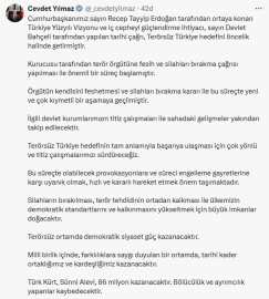 ANKARA, (DHA)- CUMHURBAŞKANI Yardımcısı Cevdet Yılmaz, kurucusu tarafından terör örgütüne fesih ve silahları bırakma çağrısı yapılması ile önemli bir sürecin başladığını, örgütün kendisini feshetmesi ve silahları bırakma kararı ile bu süreçte yeni ve çok kıymetli bir aşamaya geçildiğini belirterek, "Tarihi bir inisiyatif olan Terörsüz Türkiye, dar siyasi hesaplara, popülist söylemlere kurban edilmemelidir" dedi.Cumhurbaşkanı Yardımcısı Cevdet Yılmaz, terör örgütü PKK'nın fesih ve silah bırakma kararına ilişkin sosyal medya hesabından açıklamada bulundu. Yılmaz, Cumhurbaşkanı Recep Tayyip Erdoğan tarafından ortaya konulan Türkiye Yüzyılı vizyonu ile iç cepheyi güçlendirme ihtiyacı ve Devlet Bahçeli tarafından yapılan tarihi çağrının, 'Terörsüz Türkiye' hedefini öncelik haline getirdiğini belirterek, "Kurucusu tarafından terör örgütüne fesih ve silahları bırakma çağrısı yapılması ile önemli bir süreç başlamıştır. Örgütün kendisini feshetmesi ve silahları bırakma kararı ile bu süreçte yeni ve çok kıymetli bir aşamaya geçilmiştir. İlgili devlet kurumlarımızın titiz çalışmaları ile sahadaki gelişmeler yakından takip edilecektir. Terörsüz Türkiye hedefinin tam anlamıyla başarıya ulaşması için çok yönlü ve titiz çalışmalarımızı sürdüreceğiz. Bu süreçte olabilecek provokasyonlara ve süreci engelleme gayretlerine karşı uyanık olmak, hızlı ve kararlı hareket etmek önem taşımaktadır. Silahların bırakılması, terör tehdidinin ortadan kalkması ile ülkemizin demokratik standartlarını ve kalkınmasını yükseltmek için büyük imkanlar doğacaktır" ifadelerini kullandı.'BÖLÜCÜLÜK VE AYRIMCILIK YAPANLAR KAYBEDECEKTİR'Yılmaz, terörsüz ortamda demokratik siyasetin güç kazanacağını belirterek, "Milli birlik içinde, farklılıklara saygı duyulan bir ortamda, tarihi kader ortaklığımız ve kardeşliğimiz kazanacaktır. Türk- Kürt, Sünni- Alevi, 86 milyon kazanacaktır. Bölücülük ve ayrımcılık yapanlar kaybedecektir. Sadece ülkemizde değil, bölgemizde de istikrarı güçlendirecek bu süreç, emperyalist tuzakları boşa çıkarırken, güçlü ve büyük Türkiye gerçeğini daha görünür kılacaktır. Ülkemizin bu tarihi döneminde Cumhur İttifakı’nın yanı sıra, Gazi Meclisimizde temsil edilen tüm siyasi görüşlerden partilerin, sivil toplumun desteği de önem taşımaktadır. Bu vesile ile terörle mücadelede en büyük fedakarlığı yapan aziz şehitlerimizi rahmetle anıyor; gazilerimizi, şehit ve gazi yakınlarımıza şükranlarımızı sunuyoruz. Keşke rahmetli Sırrı Süreyya Önder de büyük emek ve katkı verdiği bu sürecin geldiği bu aşamayı görebilseydi. Tarihi bir inisiyatif olan Terörsüz Türkiye, dar siyasi hesaplara, popülist söylemlere kurban edilmemelidir" dedi. (DHA)