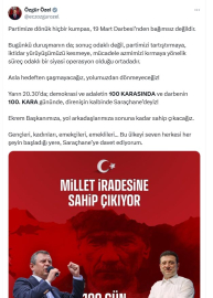 ANKARA, (DHA)- CHP Genel Başkanı Özgür Özel, "Bugünkü duruşmanın sonuç odaklı değil, partimizi tartıştırmaya, iktidar yürüyüşümüzü kesmeye, mücadele azmimizi kırmaya yönelik süreç odaklı bir siyasi operasyon olduğu ortadadır" dedi. Özel, CHP'nin 38'inci Olağan Kurultayı'nın iptali talepli davanın ertelenmesi ardından sosyal medya hesabından açıklama yaptı. Özel, "Partimize dönük hiçbir kumpas, 19 Mart darbesinden bağımsız değildir. Bugünkü duruşmanın da; sonuç odaklı değil, partimizi tartıştırmaya, iktidar yürüyüşümüzü kesmeye, mücadele azmimizi kırmaya yönelik süreç odaklı bir siyasi operasyon olduğu ortadadır. Asla hedeften şaşmayacağız, yolumuzdan dönmeyeceğiz. Yarın 20.30’da; demokrasi ve adaletin 100 karasında ve darbenin 100'üncü kara gününde, direnişin kalbinde Saraçhane’deyiz. Ekrem Başkanımıza, yol arkadaşlarımıza sonuna kadar sahip çıkacağız. Gençleri, kadınları, emekçileri, emeklileri, bu ülkeyi seven herkesi her şeyin başladığı yere, Saraçhane’ye davet ediyorum" ifadelerini kullandı. (DHA)