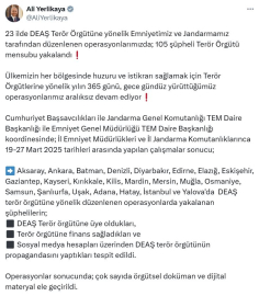 ANKARA, (DHA)- İÇİŞLERİ Bakanı Ali Yerlikaya, 23 ilde DEAŞ terör örgütüne yönelik operasyonlarda 105 şüphelinin yakalandığını duyurdu.Bakan Yerlikaya'nın, sosyal medya hesabından yaptığı açıklamaya göre; Cumhuriyet başsavcılıkları ile Jandarma Genel Komutanlığı ve Emniyet Genel Müdürlüğü birimleri koordinesinde, 19-27 Mart 2025 tarihleri arasında 23 ilde DEAŞ terör örgütüne yönelik operasyonlar düzenlendi. Operasyonlarda 105 şüpheli yakalandı, çok sayıda örgütsel doküman ve dijital materyal ele geçirildi. Şüphelilerin; DEAŞ terör örgütüne üye oldukları, terör örgütüne finans sağladıkları ve sosyal medya hesapları üzerinden DEAŞ terör örgütünün propagandasını yaptıkları tespit edildi. Bakan Yerlikaya, "Ülkemizin her bölgesinde huzuru ve istikrarı sağlamak için terör örgütlerine yönelik yılın 365 günü, gece gündüz yürüttüğümüz operasyonlarımız aralıksız devam ediyor. Valilerimizi, operasyonları koordine eden Cumhuriyet başsavcılıklarımızı ve operasyonları gerçekleştiren kahraman polislerimiz ile kahraman jandarmamızı tebrik ediyorum" dedi. (DHA)