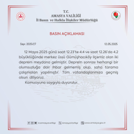3 İLÇEDE OKULLAR TATİL EDİLDİAmasya Valiliği, Gümüşhacıköy ilçesinde 3 dakika arayla 4.4 ve 4.2 büyüklüğünde meydana gelen iki depreme ilişkin açıklama yaptı. Açıklamada, “12 Mayıs 2025 günü saat 12.23’te 4.4 ve saat 12.26’da 4.2 büyüklüğünde merkez üssü Gümüşhacıköy ilçemiz olan iki deprem meydana gelmiştir. Deprem sonrası herhangi bir olumsuzluğa dair ihbar gelmemiş olup saha tarama çalışmaları yapılmıştır. Tüm vatandaşlarımıza geçmiş olsun diliyoruz” denildi.Deprem nedeniyle Gümüşhacıköy, Merzifon ve Hamamözü ilçelerinde eğitime 1 gün ara verildi. (DHA)