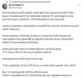ANKARA, (DHA)- İÇİŞLERİ Bakanı Ali Yerlikaya, arife günü meydana gelen 863 trafik kazasında 10 kişinin hayatını kaybettiğini, 1319 kişinin yaralandığını açıkladı.İçişleri Bakanı Ali Yerlikaya, Kurban Bayramı arifesinde kara yollarında meydana gelen kazalara ilişkin sosyal medya hesabından açıklama yaptı. Bakan Yerlikaya, "Kurban Bayram tatili başladı. Arife gününde 863 trafik kazası meydana geldi. Bu kazalarda maalesef 10 vatandaşımız olay yerinde hayatını kaybetti, 1319 vatandaşımız ise yaralandı. Hayatını kaybeden vatandaşlarımıza Allah'tan rahmet, yaralılarımıza acil şifalar diliyorum" ifadelerini kullandı. 'RADAR İŞLEMİ YAPILAN ARAÇ ORANI YÜZDE 0,9'Bayram tatili sürecince, vatandaşların güvenliği için gerekli önlemleri alarak, denetimleri büyük bir hassasiyetle sürdürdüklerini aktaran Yerlikaya, "Arife gününde Ulaştırma Bakanlığımızın verilerine göre; 2 milyon 591 bin 34 araç otoyolları kullandı. Trafik ekiplerimizce de bu araçlardan 23 bin 275'ine hız ve radar işlemi yapıldı; oran yüzde 0,9. Aşırı hız yapmayarak trafik kurallarına uyan yüzde 99,1 oranındaki her bir sürücümüze ayrı ayrı teşekkür ediyorum. Diğer yüzde 0,9'luk kısmın da daha dikkatli davranarak aşırı hız yapmayacağına hem kendisinin hem sevdiklerinin hem de masum insanların canlarını riske atmayacağına yürekten inanıyorum. Onlar da yüzde 99,1'lik kurallara uyan sürücülerimizin yanında olacaklardır. Denetlemelerimiz işlem yapmak için değil, kazaları önlemek ve can kaybımızı sıfıra indirmek içindir. Trafik kurallarına uyalım, bayram sevincimize hüzün karışmasın. Yollar, bizleri sevdiklerimize kavuşturmak için var, ayırmak için değil" dedi. (DHA)