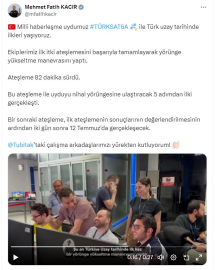 ANKARA, (DHA)- SANAYİ ve Teknoloji Bakanı Mehmet Fatih Kacır, 9 Temmuz'da uzay yolculuğuna başlayan milli haberleşme uydusu Türksat 6A ile ilgili, "Ekiplerimiz ilk itki ateşlemesini başarıyla tamamlayarak yörünge yükseltme manevrasını yaptı. Bu ateşleme ile uyduyu nihai yörüngesine ulaştıracak 5 adımdan ilki gerçekleşti" dedi.Bakan Kacır, sosyal medya platformu üzerinden yaptığı açıklamada şu ifadeleri kullandı:"Milli haberleşme uydumuz Türksat 6A ile Türk uzay tarihinde ilkleri yaşıyoruz. Ekiplerimiz ilk itki ateşlemesini başarıyla tamamlayarak yörünge yükseltme manevrasını yaptı. Ateşleme 82 dakika sürdü. Bu ateşleme ile uyduyu nihai yörüngesine ulaştıracak 5 adımdan ilki gerçekleşti. Bir sonraki ateşleme, ilk ateşlemenin sonuçlarının değerlendirilmesinin ardından 2 gün sonra 12 Temmuz'da gerçekleşecek. TÜBİTAK’taki çalışma arkadaşlarımızı yürekten kutluyorum."Yerli imkanlar ile üretilen Türkiye'nin ilk milli haberleşme uydusu Türksat 6A, ABD'nin Florida eyaletindeki Cape Canaveral Uzay Kuvvetleri İstasyonu'ndan 10 Temmuz'da saat 02.30'da SpaceX'e ait Falcon 9 roketiyle uzaya fırlatıldı. (DHA)