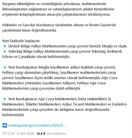 Salih HÜDAVERDİ/ ANKARA, (DHA)- ADALET Bakanı Yılmaz Tunç, Resmi Gazete’de yayımlanan Hakimler ve Savcılar Kurulu (HSK) kararıyla, vatandaşların adalet hizmetlerine erişmesinin kolaylaştırılmasının amaçlandığını açıkladı.Adalet Bakanı Yılmaz Tunç, sosyal medya hesabından yaptığı paylaşımda, “Yargının etkinliğinin ve verimliliğinin artırılması, mahkemelerde ihtisaslaşmanın sağlanması ve vatandaşlarımızın adalet hizmetlerine erişiminin kolaylaştırılması amacıyla çalışmalarımızı sürdürüyoruz" dedi.Bakan Tunç paylaşımında, Hakimler ve Savcılar Kurulu tarafından alınan ve Resmi Gazete'de yayımlanan karara göre yeni faaliyete başlayan Denizli Bölge Adliye Mahkemesinin yargı çevresinin Denizli, Muğla ve Uşak; Tekirdağ Bölge Adliye Mahkemesinin yargı çevresinin Tekirdağ, Kırklareli, Edirne ve Çanakkale olarak belirlendiğini bildirdi.Yeni kurulan Muğla Seydikemer adliye teşkilatı yargı çevresinin, Fethiye yargı alanından çıkartıldığını kaydeden Bakan Tunç, Seydikemer mahkemelerinin yargı çevresinin Seydikemer ilçesi mülki sınırları olarak belirlendiğini açıkladı.Ağır Ceza Mahkemeleri yönünden Seydikemer Adliyesinin, Fethiye Ağır Ceza Mahkemelerinin yargı çevresine dahil edildiğini bildiren Tunç, yeni kurulan ağır ceza mahkemeleri, infaz hakimlikleri, iş mahkemeleri, tüketici mahkemeleri, asliye ticaret mahkemeleri ve kadastro mahkemelerinin yargı çevrelerinin de aldıkları karar doğrultusunda belirlendiğini söyledi. (DHA)