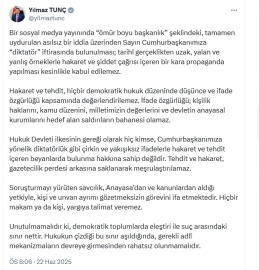 ANKARA, (DHA)- ADALET Bakanı Yılmaz Tunç, “’Ömür boyu başkanlık’ şeklindeki, tamamen uydurulan asılsız bir iddia üzerinden Sayın Cumhurbaşkanımıza ‘diktatör’ iftirasında bulunulması; tarihî gerçeklikten uzak, yalan ve yanlış örneklerle hakaret ve şiddet çağrısı içeren bir kara propaganda yapılması kesinlikle kabul edilemez” açıklamasında bulundu. Adalet Bakanı Yılmaz Tunç, sosyal medya hesabından paylaşım yaparak, bir sosyal medya yayınında Cumhurbaşkanı Recep Tayyip Erdoğan’a yönelik ‘Ömür boyu başkanlık’ iddialarının yalan yanlış ve kabul edilemez olduğunu söyledi. Bakan Tunç paylaşımında, “‘Ömür boyu başkanlık’ şeklindeki, tamamen uydurulan asılsız bir iddia üzerinden Sayın Cumhurbaşkanımıza ‘diktatör’ iftirasında bulunulması; tarihî gerçeklikten uzak, yalan ve yanlış örneklerle hakaret ve şiddet çağrısı içeren bir kara propaganda yapılması kesinlikle kabul edilemez. Hakaret ve tehdit, hiçbir demokratik hukuk düzeninde düşünce ve ifade özgürlüğü kapsamında değerlendirilemez. İfade özgürlüğü; kişilik haklarını, kamu düzenini, milletimizin değerlerini ve devletin anayasal kurumlarını hedef alan saldırıların bahanesi olamaz” dedi.Bakan Tunç, Hukuk Devleti ilkesinin gereği olarak hiç kimse, Cumhurbaşkanı Erdoğan’a yönelik diktatörlük gibi çirkin ve yakışıksız ifadelerle hakaret ve tehdit içeren beyanlarda bulunma hakkına sahip olmadığını belirterek, “Tehdit ve hakaret, gazetecilik perdesi arkasına saklanarak meşrulaştırılamaz. Soruşturmayı yürüten savcılık, Anayasa’dan ve kanunlardan aldığı yetkiyle, kişi ve unvan ayrımı gözetmeksizin görevini ifa etmektedir. Hiçbir makam ya da kişi, yargıya talimat veremez. Unutulmamalıdır ki, demokratik toplumlarda eleştiri ile suç arasındaki sınır nettir. Hukukun çizdiği bu sınır aşıldığında, gerekli adlî mekanizmaların devreye girmesinden rahatsız olunmamalıdır” ifadelerini kullandı. (DHA)
