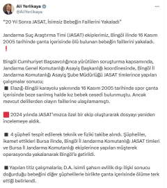 Umutcan ÖREN/ANKARA, (DHA)- İÇİŞLERİ Bakanı Ali Yerlikaya, Jandarma Suç Araştırma Timi (JASAT) ekiplerinin, Bingöl'de 16 Kasım 2005 tarihinde çanta içerisinde ölü bulunan isimsiz bebeğin faillerinin yakalandığını ve olayla ilgili 1 kişinin tutuklandığını duyurdu.Bakan Yerlikaya, sosyal medya hesabından yaptığı açıklamada, "Bingöl Cumhuriyet Başsavcılığınca yürütülen soruşturma kapsamında, Jandarma Genel Komutanlığı Asayiş Başkanlığı koordinesinde, Bingöl İl Jandarma Komutanlığı Asayiş Şube Müdürlüğü JASAT timlerince yapılan çalışmalar sonucu; Elazığ-Bingöl kara yolu yakınında 16 Kasım 2005 tarihinde spor çanta içerisinde beze sarılmış halde kız bebek cesedi bulunmuştu. Ancak mevcut delillerden olayın faillerine ulaşılamamıştı. 2024 yılında JASAT'ımızca özel bir ekip oluşturarak dosyayı yeniden incelemeye aldık. 4 şüpheli tespit edilerek teknik ve fiziki takibe alındı. Şüpheliler, ikamet ettikleri Bursa ilinde, Bingöl İl Jandarma Komutanlığı JASAT timleri ve Bursa İl Jandarma Komutanlığı ekiplerince yapılan müşterek operasyonda yakalanarak Bingöl'e getirildi" dedi. 'JASAT, FAİLİ MEÇHUL CİNAYETLERİN YÜZDE 100'ÜNÜ AYDINLATTI'Yerlikaya, "Yapılan titiz çalışmalarla; D.A. isimli şahsın evlilik dışı ilişki sonucu doğurduğu bebeğini diğer şüphelilerle birlikte çanta içerisinde ölüme terk ettiği belirlendi. Mahkemeye sevk edilen şüphelilerden D.A. isimli şahıs tutuklandı. 3 şüpheli hakkında ise adli kontrol kararı verildi. JASAT bu yıl incelemeye aldığı faili meçhul cinayetlerin yüzde 100'ünü aydınlattı. Bingöl Valimizi, operasyonu koordine eden Bingöl Cumhuriyet Başsavcılığımızı ve operasyonları gerçekleştiren Bingöl İl Jandarma Komutanlığımız ile JASAT Timlerimizi tebrik ediyorum. İsim dahi konulmadan bir bebeği ölüme terk eden vicdansızlar, JASAT'tan kaçamadı. Hiçbir suçun cezasız kalmaması için özel ekiplerimiz ile gece-gündüz mücadelemize devam ediyoruz" ifadelerini kullandı. (DHA)