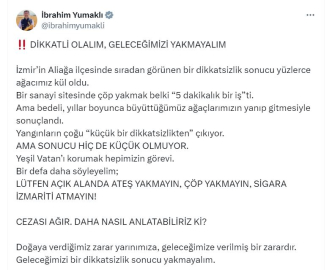 ANKARA, (DHA)- TARIM ve Orman Bakanı İbrahim Yumaklı, İzmir'in Aliağa ilçesinde dikkatsizlik sonucu çıkan yangında yüzlerce ağacın kül olduğunu belirterek, "Lütfen açık alanda ateş yakmayın, çöp yakmayın, sigara izmariti atmayın. Cezası ağır. Daha nasıl anlatabiliriz ki? Doğaya verdiğimiz zarar yarınımıza, geleceğimize verilmiş bir zarardır" dedi.Bakan Yumaklı, sosyal medya hesabından yaptığı açıklamada, "Dikkatli olalım, geleceğimizi yakmayalım. İzmir'in Aliağa ilçesinde sıradan görünen bir dikkatsizlik sonucu yüzlerce ağacımız kül oldu. Bir sanayi sitesinde çöp yakmak belki '5 dakikalık bir iş'ti. Ama bedeli, yıllar boyunca büyüttüğümüz ağaçlarımızın yanıp gitmesiyle sonuçlandı. Yangınların çoğu küçük bir dikkatsizlikten çıkıyor. Ama sonucu hiç de küçük olmuyor. Yeşil Vatan'ı korumak hepimizin görevi. Bir defa daha söyleyelim; Lütfen açık alanda ateş yakmayın, çöp yakmayın, sigara izmariti atmayın. Cezası ağır. Daha nasıl anlatabiliriz ki? Doğaya verdiğimiz zarar yarınımıza, geleceğimize verilmiş bir zarardır. Geleceğimizi bir dikkatsizlik sonucu yakmayalım" ifadelerini kullandı. (DHA)