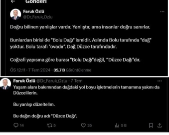 Mutlu YUCA / BOLU, (DHA)- DÜZCE Belediye Başkanı AK Parti'li Faruk Özlü'nün sosyal medya hesabından Bolu Dağı'nın adının Düzce Dağı olduğunu ifade etmesine, Bolu Belediye Başkanı CHP'li Tanju Özcan sosyal medya hesabından cevap vererek, "Kaynaşlı'yı, Yığılca'yı ve Akçakoca'yı elinden aldırma bana. Akıllı ol" diyerek cevap verdi.Düzce Belediye Başkanı Faruk Özlü, dün sosyal medya hesaplarından Bolu Dağı'nın adının Düzce Dağı olduğunu ifade eden paylaşımda bulundu. Özlü paylaşımında, "Doğru bilinen yanlışlar vardır. Yanlıştır, ama insanlar doğru sanırlar. Bunlardan birisi de 'Bolu Dağı' ismidir. Aslında Bolu tarafında 'dağ' yoktur. Bolu tarafı ovadır. Dağ Düzce tarafındadır. Coğrafi yapısına göre burası 'Bolu Dağı' değil, 'Düzce Dağı'dır. Yaşam alanı bakımından, dağdaki yol boyu işletmelerin tamamına yakını da Düzcelilerin. Bu yanlışı düzeltelim. Bu dağın doğru adı 'Düzce Dağı' dedi.'AKILLI OL'Özlü'nün açıklamalarına CHP'li Bolu Belediye Başkanı Tanju Özcan ise sosyal medya hesabından yaptığı paylaşımla tepki göstererek şu cevabı verdi: "Düzce'nin mevcut belediye başkanı Faruk Özlü. Bolu Dağı'na göz koymuş. Bolu Dağı, Bolu'nun simgesidir. Dimyat'a pirince giderken evdeki bulgurdan olma. Kaynaşlı'yı, Yığılca'yı ve Akçakoca'yı elinden aldırma bana. Akıllı ol." (DHA)FOTOĞRAFLI