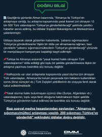 Salih HÜDAVERDİ/ ANKARA, (DHA)- CUMHURBAŞKANLIĞI İletişim Başkanlığı Dezenformasyonla Mücadele Merkezi (DMM) tarafından yapılan açıklamada, "'Almanya ile sığınmacı-mülteci anlaşması yapıldı, 200 sığınmacı Türkiye'ye gönderildi' şeklindeki iddialar doğru değildir" denildi.DMM'nin sosyal medya hesabından yapılan açıklamada, "Bazı sosyal medya hesaplarından paylaşılan, 'Almanya ile sığınmacı-mülteci anlaşması yapıldı, 200 sığınmacı Türkiye'ye gönderildi' şeklindeki iddialar doğru değildir. Geçtiğimiz günlerde Alman basınında, 'Almanya ile Türkiye'nin anlaşmaya vardığı, bu anlaşma kapsamında yasal ikamet izni olmayan 13 bin 500 Türk vatandaşının Türkiye'ye gönderilebileceği' şeklinde yanıltıcı haberler servis edilmiş, bu iddialar Dışişleri Bakanlığımız ve Merkezimizce yalanlanmıştır. İddiaya dayanak olarak gösterilen haberlerde, 'yabancı sığınmacıların Türkiye'ye gönderilmesine' ilişkin bir iddia yer almamasına rağmen, bazı çevrelerin 'yabancı sığınmacı-mültecilerin Türkiye'ye gönderileceği' yönünde bir manipülasyon kampanyası başlattığı tespit edilmiştir. Türkiye ile Almanya arasında 'yasal ikamet hakkı olmayan Türk vatandaşlarının' iddia edildiği gibi toplu bir şekilde gönderilmesine ilişkin bir anlaşma yapılması kesinlikle söz konusu değildir. Halihazırda var olan anlaşmalar kapsamında yasal oturma izni olmayan Türk vatandaşları, Almanya'da hukuki çerçevede tüm haklarını kullandıktan sonra (itiraz süreçleri vb.) Türk Dışişleri yetkililerinin de onayıyla ferdi olarak kabul edilebilmektedir" ifadelerine yer verildi.Öte yandan açıklamada, yasal oturma hakkı bulunmayan üçüncü ülke (Suriye, Afganistan vb.) vatandaşlarının, toplu veya ferdi olduğuna bakılmaksızın hiçbir şekilde Türkiye'ye gönderiminin kabul edilmesinin söz konusu olmadığı belirtildi.Ayrıca, '200 sığınmacı Türkiye'ye gönderildi' iddiasıyla sosyal medyada paylaşılan görüntülerin, FETÖ'nün propaganda hesapları tarafından kurgulanıp servis edildiği, Frankfurt–Hahn Havaalanında kaydedildiği tespit edilen görüntülerde yolcuların bindiği havayolu şirketinin, yakın tarihte Almanya'dan Türkiye'ye uçuşunun da bulunmadığı ifade edildi. (DHA)