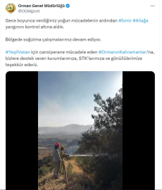 OGM'DEN PERSONELE VE DESTEK VERENLERE TEŞEKKÜROrman Genel Müdürlüğü (OGM), İzmir'deki yangına ilişkin sosyal medya hesabından açıklama yaptı. Açıklamada, "Gece boyunca verdiğimiz yoğun mücadelenin ardından İzmir Aliağa yangınını kontrol altına aldık. Bölgede soğutma çalışmalarımız devam ediyor. Yeşil Vatan için cansiparane mücadele eden ormanın kahramanlarına, bizlere destek veren kurumlarımıza, STK'larımıza ve gönüllülerimize teşekkür ederiz" denildi. (DHA)