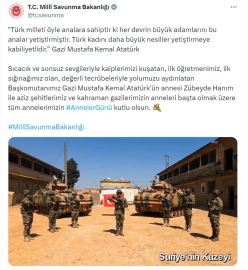ANKARA, (DHA)- MİLLİ Savunma Bakanlığı (MSB), Anneler Günü için özel bir video hazırladı. Videoda, sınır ötesi ve yurt içindeki kritik noktalarda görev yapan askerlerin Anneler Günü mesajlarına yer verildi.Bakanlığın sosyal medya hesabından paylaşılan videoda, sınır ötesi ve yurt içindeki kritik noktalarda görev yapan Türk Silahlı Kuvvetleri personelinin annelerine duygularını ifade ettiği görüntüler yer aldı. Gazi Mustafa Kemal Atatürk'ün "Türk milleti öyle analara sahiptir ki her devrin büyük adamlarını bu analar yetiştirmiştir. Türk kadını daha büyük nesiller yetiştirmeye kabiliyetlidir" sözü ile paylaşılan videoda ayrıca şu ifadelere yer verildi:"Sıcacık ve sonsuz sevgileriyle kalplerimizi kuşatan, ilk öğretmenimiz, ilk sığınağımız olan, değerli tecrübeleriyle yolumuzu aydınlatan Başkomutanımız Gazi Mustafa Kemal Atatürk'ün annesi Zübeyde Hanım ile aziz şehitlerimiz ve kahraman gazilerimizin anneleri başta olmak üzere tüm annelerimizin Anneler Günü kutlu olsun." (DHA)