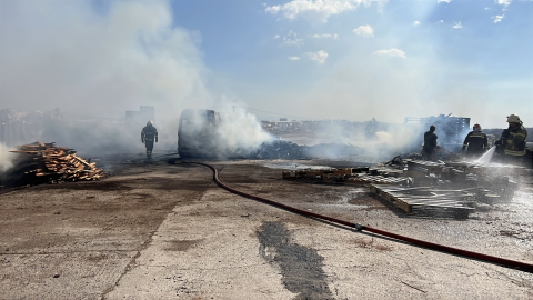 Palet imalathanesinin depolama sahasındaki yangında minibüs yandı
