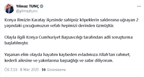 BAKAN TUNÇ'TAN AÇIKLAMAAdalet Bakanı Yılmaz Tunç, sosyal medya hesabından yaptığı açıklamada, "Konya ilimizin Karatay ilçesinde sahipsiz köpeklerin saldırısına uğrayan 2 yaşındaki çocuğumuzun vefatı hepimizi derinden üzmüştür. Olayla ilgili Konya Cumhuriyet Başsavcılığı tarafından adli soruşturma başlatılmıştır. Yaşanan elim olayda hayatını kaybeden evladımıza Allah'tan rahmet, kederli ailesine ve yakınlarına başsağlığı ve sabır diliyorum" dedi. (DHA)
