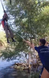 Mert CONA/AYDIN,(DHA)-AYDIN'ın Efeler ilçesinde Büyük Menderes Nehri'nden traktörüyle geçmek isterken su seviyesinin aniden yükselmesiyle mahsur kalan çiftçi B.Y., vinçle kurtarıldı. O anlar, cep telefonuyla kaydedildi.Olay, saat 08.30 sıralarında Baltaköy Mahallesi'nde meydana geldi. Çiftçi B.Y., Büyük Menderes Nehri'nden traktörüyle geçmek istedi. Bu sırada regülatör kapaklarının açılmasıyla birlikte su seviyesi yükseldi. Nehirde mahsur kalan B.Y., traktörün üzerine çıkıp, durumu 112 Acil Çağrı Merkezi'ne bildirdi. İhbarla bölgeye itfaiye, AFAD, sağlık ve jandarma ekipleri sevk edildi. Ekipler, halatlı sistem kurarak vinçle çiftçiyi bulunduğu yerden kurtardı. B.Y.'nin durumunun iyi olduğu öğrenildi. Kurtarma anları, cep telefonuyla kaydedildi.(DHA)